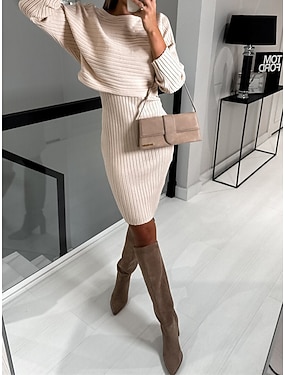 女性用 ドレスセット セータードレス カジュアルドレス シースドレス ファッション ストリートファッション 平織り リブ ミディドレス 長袖 クルーネック アウトドア デート ブラック ベージュ 秋 冬 レギュラー