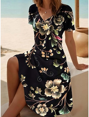 女性用 ミディドレス カジュアルドレス スケーターワンピース サマードレス ファッション 近代の 日常 ビーチ 週末 レギュラー フラワー 半袖 Vネック ブラック ホワイト ブルー パープル 夏