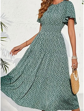 女性用 ミディドレス カジュアルドレス スイングドレス A ラインドレス スタイリッシュ カジュアル バケーション 日常 レギュラー フラワー 半袖 Vネック グリーン 夏