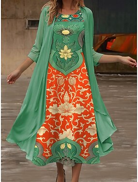女性用 ドレスセット A ラインドレス ミディドレス エレガント カジュアル フラワー グラフィック パッチワーク プリント ミディドレス ハーフスリーブ クルーネック バケーション デート ピンク ブルー パープル 夏 春 レギュラー
