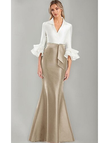 ブラックアンドホワイト フォーマルドレス 人魚 トランペットイブニングガウン エレガントドレス フォーマル 結婚式 フロアレングス ハーフスリーブ シャツカラーストレッチサテン フリル付き