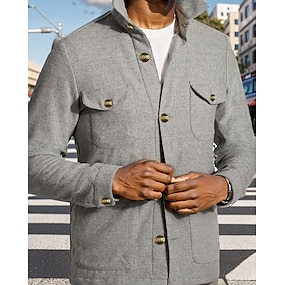 男性用 ジャケット カジュアルジャケット アウトドア デイリーウェア ウォーム ボタン ポケット 秋 冬 平織り ファッション ストリートファッション スタンド レギュラー ブラック ブルー グレー ジャケット