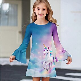 女子 3D グラフィック ユニコーン ドレス 長袖 夏 春 バケーション 日常 祝日 プリンセス 美しい 甘い 子供 4〜12年 カジュアルドレス A ラインドレス 膝丈 レギュラー