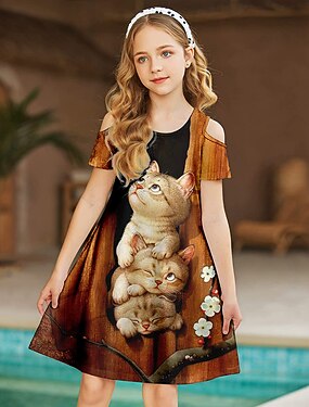 女子 3D 動物 猫 ドレス 半袖 夏 春 バケーション 日常 祝日 プリンセス 美しい 甘い 子供 4〜12年 カジュアルドレス 膝丈 レギュラー
