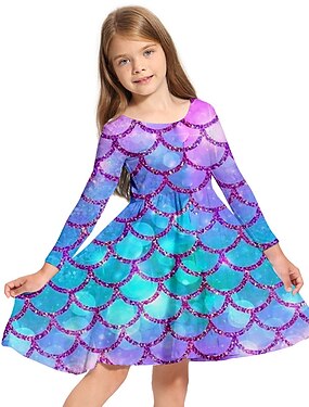 女子 3D マーメイド ドレス 長袖 3Dプリント 春 秋 日常 祝日 バケーション かわいいスタイル カジュアル 甘い 子供 3〜10年 スイングドレス A ラインドレス 膝上 ポリエステル レギュラー