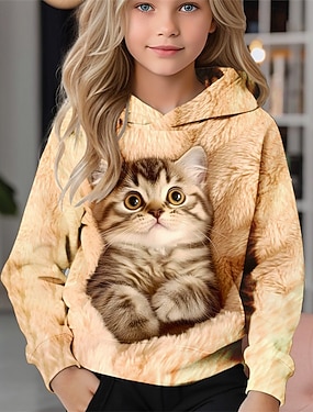 女の子 3D 猫 パーカー 長袖 秋 冬 ファッション 愛らしい ベーシック 子供 4〜12年 フード付き アウトドア カジュアル 日常 レギュラー