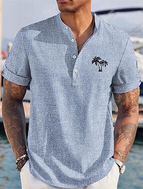 男性用 シャツ リネンシャツ ビーチシャツ アロハシャツ ココナッツの木 アウトドア バケーション ネイビーブルー ブルー グリーン カーキ色 半袖 折襟 夏 衣類