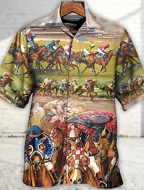 ケンタッキーダービー 男性用 馬 ビール 競馬 シャツ アロハシャツ ボタンアップシャツ 半袖 スポーツ ファッション ストリートファッション アウトドア カジュアル ハワイアン 夏 春 キューバンカラー プリント 面白いケンタッキーダービーシャツ ブラック イエロー ブルー グリーン