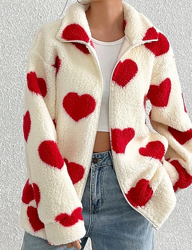 女性用 テディコート 保温 快適 ジッパー カジュアル ハート バケーション デイリーウェア お出かけ 週末 レギュラー スタンド ルーズフィット 長袖 アウターウェア ブラック ルビーレッド カーキ色 秋 冬
