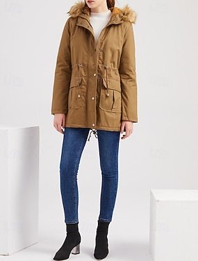 女性用 冬物コート パーカージャケット 保温 快適 ジッパー ポケット カジュアル 平織り バケーション お出かけ 週末 レギュラー フード付き レギュラー 長袖 アウターウェア ブラック カーキ色 アーミーグリーン 秋 冬