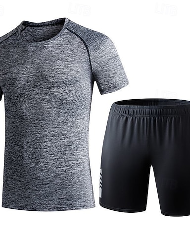 男性用 ソリッド ワークアウトスーツ 2ピーススポーツセット 半袖 トップス 夏 速乾性 ビデオ圧縮 吸汗性 ジムトレーニング アクティブトレーニング 運動 スポーツウェア アクティブウェア グレー