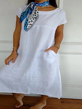 女性用 ミディドレス カジュアルドレス コットンリネンドレス ファッション クラシック アウトドア 祝日 お出かけ レギュラー 平織り 半袖 クルーネック ブラック ホワイト カーキ色 夏