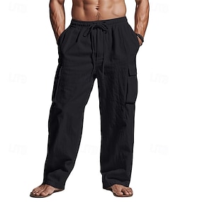 男性用 カーゴパンツ リネンパンツ ズボン サマーパンツ ビーチパンツ ドローストリング 弾性ウエスト マルチポケット 平織り 履き心地よい ソフト 全長 アウトドア カジュアル 日常 旅行度假风 ファッション ブラック ホワイト