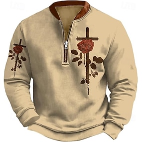男性用 クォータージッパースウェットシャツ ブラック カーキ色 ハーフジッパー 十字架 ローズ フロントポケット クォータージップ 日常 祝日 お出かけ ポリエステル ヴィンテージ ストリートファッション レトロ風 秋 冬 衣類 パーカー トレーナー