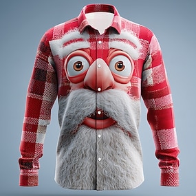 クリスマス 男性用 サンタクロース グリッド / タータンチェック 3Dカトゥーン シャツ ボタンアップシャツ 長袖 おかしい アウトドア 祝日 春 秋 折襟 3Dプリント リネンライクシャツ 赤、緑 ルビーレッド