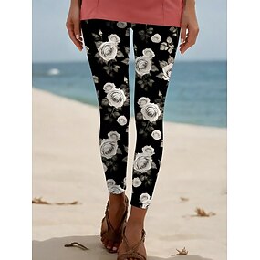 女性用 パンツ レギンス 心地よいレギンス ストリートファッション カジュアル 全長 ハイウエスト フラワー 弾性ウエスト プリント 通気性 快適 伸縮性あり バケーション ストリート デイリーウェア ブラック 夏 春 秋 レギュラー