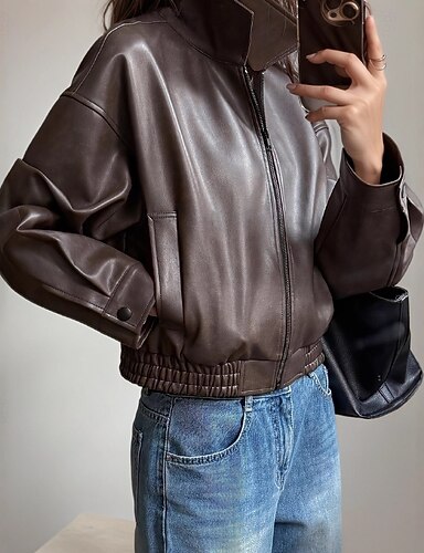 女性用 レザージャケット 保温 快適 ジッパー ポケット カジュアル 平織り バケーション デイリーウェア お出かけ 週末 レギュラー 折襟 レギュラー 長袖 アウターウェア ブラウン 秋 冬