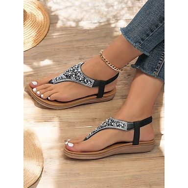 キラキラ輝く女性用Tストラップサンダル - ラインストーンのアクセントが付いた快適でスタイリッシュなウェッジサンダル。カジュアルなお出かけ、夏のパーティー、特別な機会に最適です。