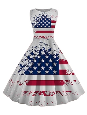 女性用 レトロ 1950年代 ヴィンテージ ティードレス ミディドレス デイリー デート シャーリング プリント アメリカ国旗 クルーネック ノースリーブ スリム 夏 春 2023 ブラック ホワイト S M L XL