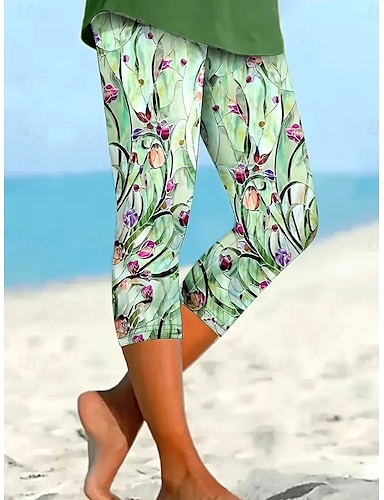 ウィメンズ レギンス カプリパンツ ハイエラスティシティ ファッション ストリートウェア ひざ丈 ハイウエスト フローラル グラフィック プリント 通気性 柔らかい アウトドア デイリー グリーン 夏 春 レギュラーフィット