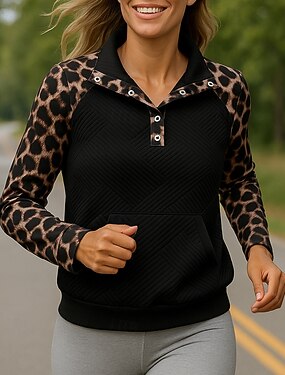 女性用 プルオーバースウェットシャツ カジュアルパーカー ポケット 長袖 トップス アスレイジャー レオパード 日焼け防止 防風 屋外 ランニング スポーツウェア アクティブウェア ブラック