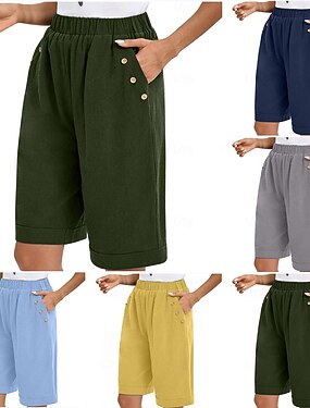 女性用 ショーツ スラックス カジュアル 膝丈 ナチュラルウエスト 平織り ポケット 弾性ウエスト 快適 屋外 デイリーウェア お出かけ ピーコックブルー アプリコット ライトブラウン ライトスカイブルー 夏 レギュラー