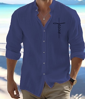 男性用 シャツ ビーチシャツ ボタンアップシャツ 信仰 アウトドア バケーション ブラック ホワイト ピンク オレンジ 長袖 スタンドカラー 春 & 秋 衣類 プリント