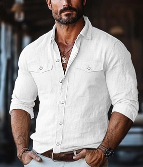男性用 シャツ リネンシャツ サマーシャツ ボタンアップシャツ 純色 バケーション ストリート ホワイト グリーン カーキ色 ライトブルー 長袖 カラー 衣類 ポケット