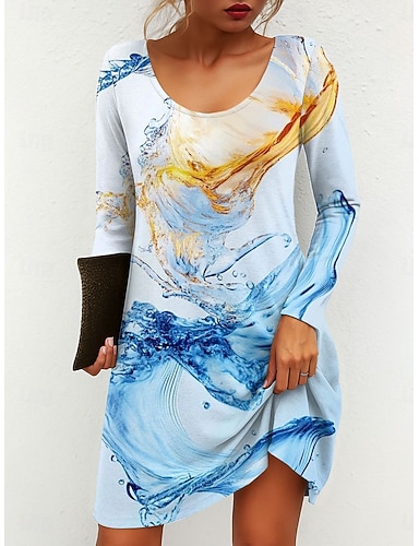 女性のミニドレス クルーネック ロングスリーブ カジュアルドレス Tシャツドレス ティードレス Aラインドレス カジュアル レギュラーフィット グラフィック 幾何学的 抽象 ブルー パープル グリーン グレー 秋 冬