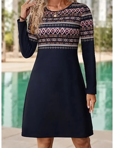 女性用 ミニドレス セータードレス シフトドレス パーティー カジュアル ボヘミアン 祝日 お出かけ レギュラー グラフィック 幾何学模様 長袖 クルーネック ロイヤルブルー ライトブラウン ブルー スカイブルー 春 秋 冬