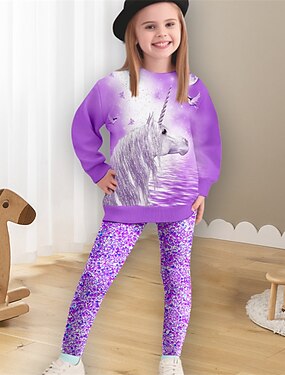 女の子 3D カートゥン ユニコーン スウェットシャツ&レギンスセット セット 長袖 3Dプリント 秋 冬 活発的 ファッション 日常 子供 3〜12年 クルーネック アウトドア バケーション デート レギュラー
