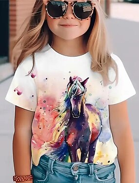 女の子 3D 動物 馬 Tシャツ 半袖 3Dプリント 夏 春 活発的 ファッション かわいいスタイル 子供 3〜12年 アウトドア 日常 屋内 レギュラー