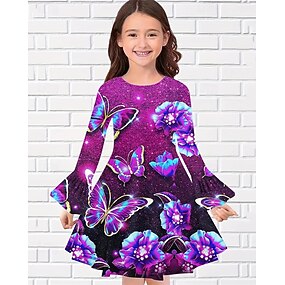 女子 3D グラフィック バタフライ ドレス 長袖 3Dプリント 夏 秋 スポーツ 日常 祝日 かわいいスタイル カジュアル 美しい 子供 3〜12年 カジュアルドレス A ラインドレス 膝上 ポリエステル レギュラー