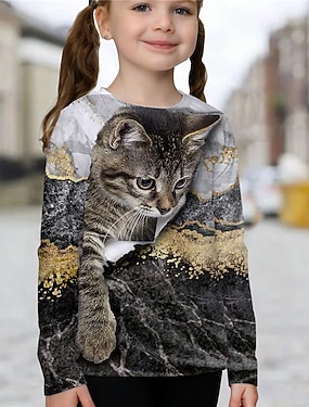 女の子 3D 動物 猫 Tシャツ 長袖 3Dプリント 夏 春 秋 活発的 スポーツ ファッション 子供 3〜12年 アウトドア 日常 屋内 レギュラー