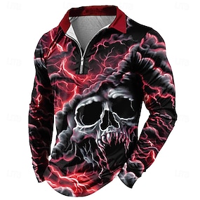 Halloween 男性用 スカル ポロ 長袖 ポロシャツ カジュアル 暗い アウトドア ストリート デイリーウェア 3Dプリント クォータージップポロ 春 秋 冬 ホワイト ルビーレッド ブルー