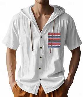 男性用 シャツ リネンシャツ サマーシャツ ビーチウェア ボタンアップシャツ 純色 バケーション ストリート ブラック ホワイト ネイビーブルー スカイブルー 半袖 フード付き 夏 春 衣類 パッチワーク