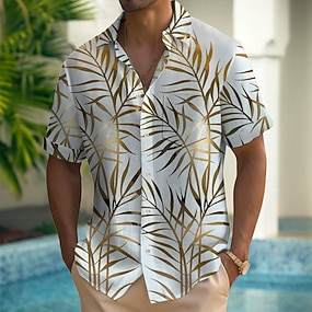 男性用 シュロの葉 熱帯植物 アロハシャツ ボタンアップシャツ 半袖 ハワイアン リゾート バケーション 祝日 ビーチウェア 夏 春 折襟 3Dプリント 襟付きシャツ ホワイト