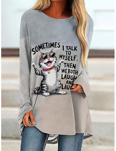 レディース Tシャツ 長袖 グラフィック アニマル キャット ヴィンテージ スタイリッシュ クラシック 長袖 クルーネック ラウンドネック レギュラー トップス デイリープリント グレー 春 秋 プリフォール