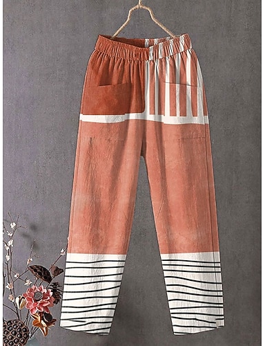 レディース リネン混紡パンツ トラウザーズ バケーション ヴィンテージ エスニックスタイル フルレングス ミッドウエスト ストライプ 伸縮性ウエストバンド 快適 通気性 ソフト 非伸縮性 バケーション ホーム ベージュ 夏 春 秋 ルーズフィット