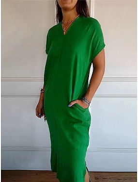 女性用 ミディドレス コットンリネンドレス カジュアルドレス ベーシック カジュアル バケーション 日常 レギュラー 純色 半袖 Vネック ブラック グリーン 夏