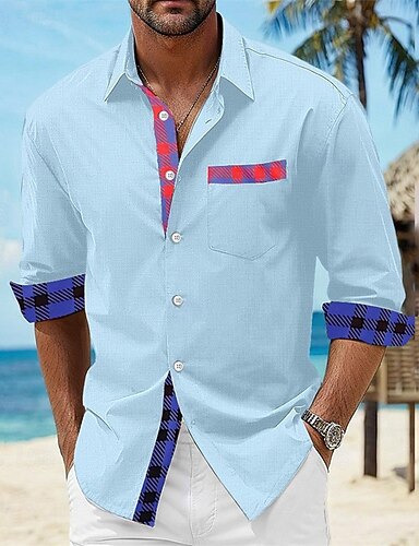 男性用 シャツ サマーシャツ カジュアルシャツ ビーチシャツ ボタンアップシャツ ルビーレッド ネイビーブルー ロイヤルブルー ブルー オレンジ 長袖 チェック ラペル バケーション ハワイアン ボタンダウン 衣類 コットン100% ファッション カジュアル 快適