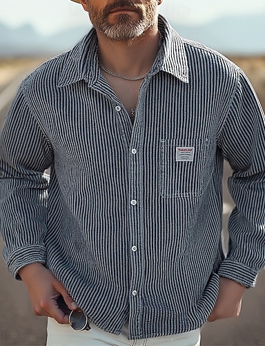 男性用 シャツ カジュアルシャツ ボタンアップシャツ デニムシャツ ブラック ブルー 長袖 縞 ラペル バケーション ハワイアン ポケット 衣類 ポリエステル ファッション カジュアル 快適