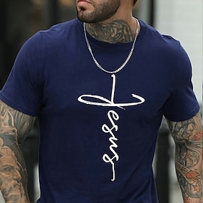 メンズ キリスト教信仰 イエス クロスグラフィック Tシャツ ショートスリーブ ブルー