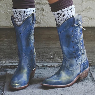 女性用 ブーツ カウボーイブーツ プラスサイズ アウトドア ワーク 日常 ミッドカーフブーツ リベット 編み上げ ブロックヒール チャンキーヒール ポインテッドトゥ エレガント ファッション クラシック PUレザー ローファー ブラック レッド ブルー