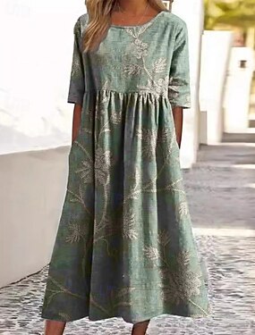 女性用 アーミーグリーン ピンク ブルー 夏 春 マキシドレス リネン風ドレス カジュアルドレス コットンリネンドレス ベーシック 近代の 日常 週末 ルーズフィット 平織り クルーネック