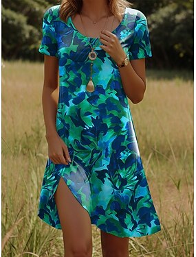 女性用 ミニドレス カジュアルドレス T シャツドレス サンドレス A ラインドレス スタイリッシュ カジュアル ビーチ レギュラー フラワー グラフィック リーフ柄 半袖 クルーネック スクープネック ブルー インクブルー ライトブルー 夏 春