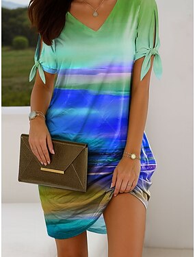 女性用 ミニドレス T シャツドレス サンドレス サマードレス 旅行度假风 カジュアル ボヘミアン 日常 お出かけ レギュラー オンブル' グラフィック 半袖 Vネック ブルー 夏