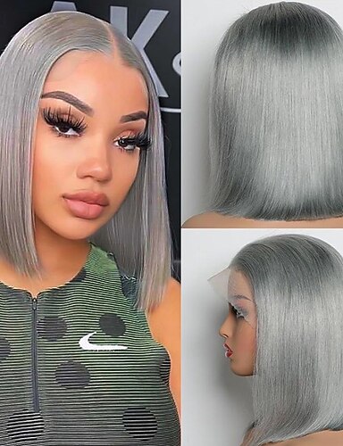 グレーの人毛13x4レースフロントウィッグボブショートストレートヘアレースウィッグ150%密度