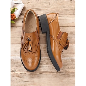 ブローグのディテール、フリンジ、タッセルのアクセントが付いた女性用のブラウンのローファー。カジュアルにもオフィスにも使えるクラシックなヴィンテージ風の靴です。