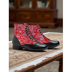 1920年代のヴィンテージエドワード朝風レースアップアンクルブーツ。ギャツビーパーティー、ステージパフォーマンス、レトロコスプレに最適な赤い花柄ブロケードと黒の合成皮革のドレスシューズ。